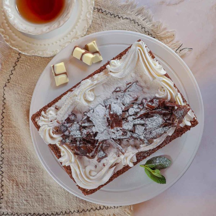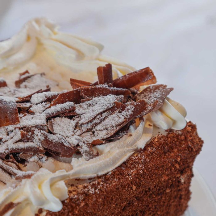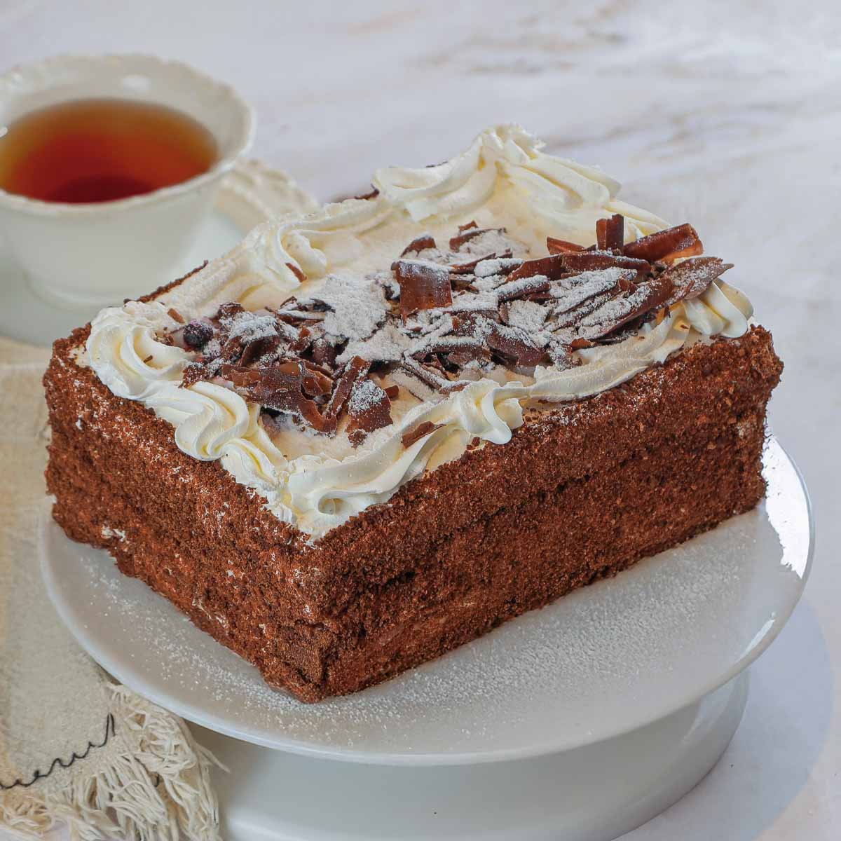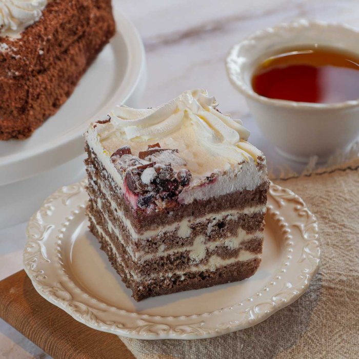 Бисквит п/ф (молоко, мука пшеничная в/с, сахар, яйцо куриное, черемуха молотая, масло подсолнечное, сода), крем п/ф (сметана, сахар), начинка п/ф (молоко, сахар, черемуха молотая), гель кондитерский, черника, глазурь шоколадная.