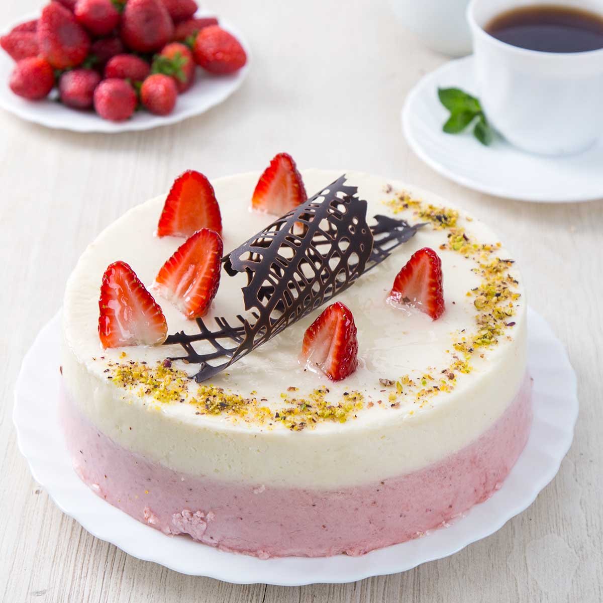 Сахар-песок, сметана, сливки растительные, сливки животные, шоколад молочный, ягода клубника, яйцо куриное, гель кондитерский, вишня коктейльная, мука пшеничная в/с, шоколадная глазурь темная, желатин, орех фисташки, коньяк, масло подсолнечное, ароматизат.