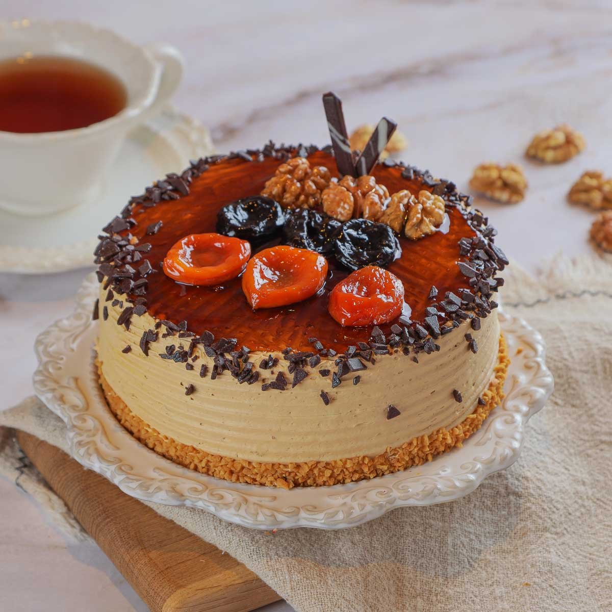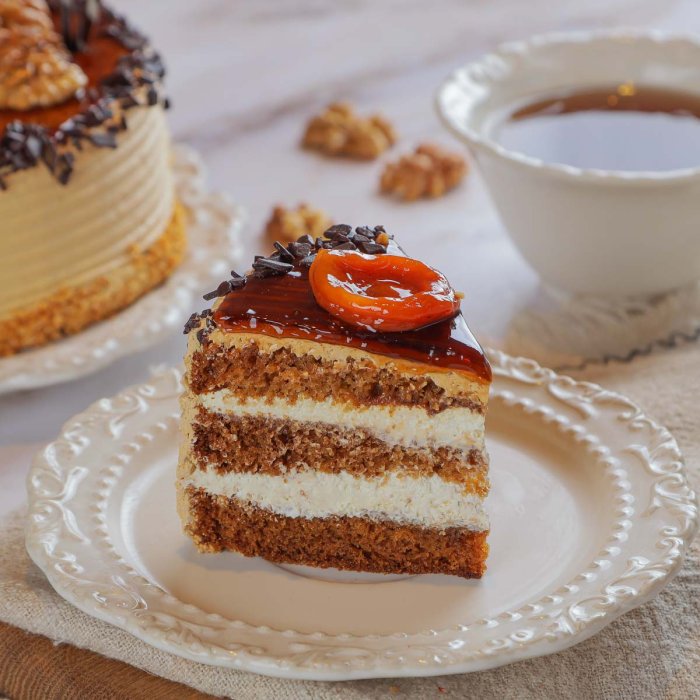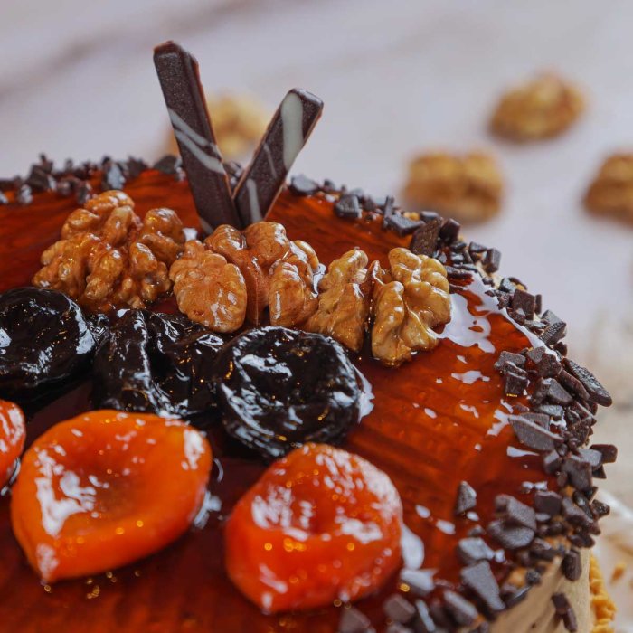 "Медовый со сметаной" – это богатый вкус и насыщенная текстура. Лёгкие коржи с медом и нотками ванили пропитаны сливочным кремом, дополненным черносливом и курагой. Грецкие орехи и белая шоколадная глазурь создают изысканное сочетание. Ароматизатор "Ром" добавляет глубины вкусу, а удобная доставка позволит наслаждаться этим десертом в любое время.