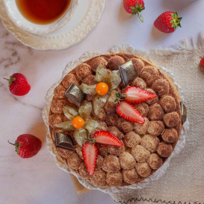 Молоко сгущенное вареное, мука пшеничная в/с, масло сливочное, сметана, сахар, молоко, клубника, шоколадная глазурь, какао порошок, физалис, пудра сахарная, яйцо куриное, коньяк, сода, ванилин, краситель пищевой.