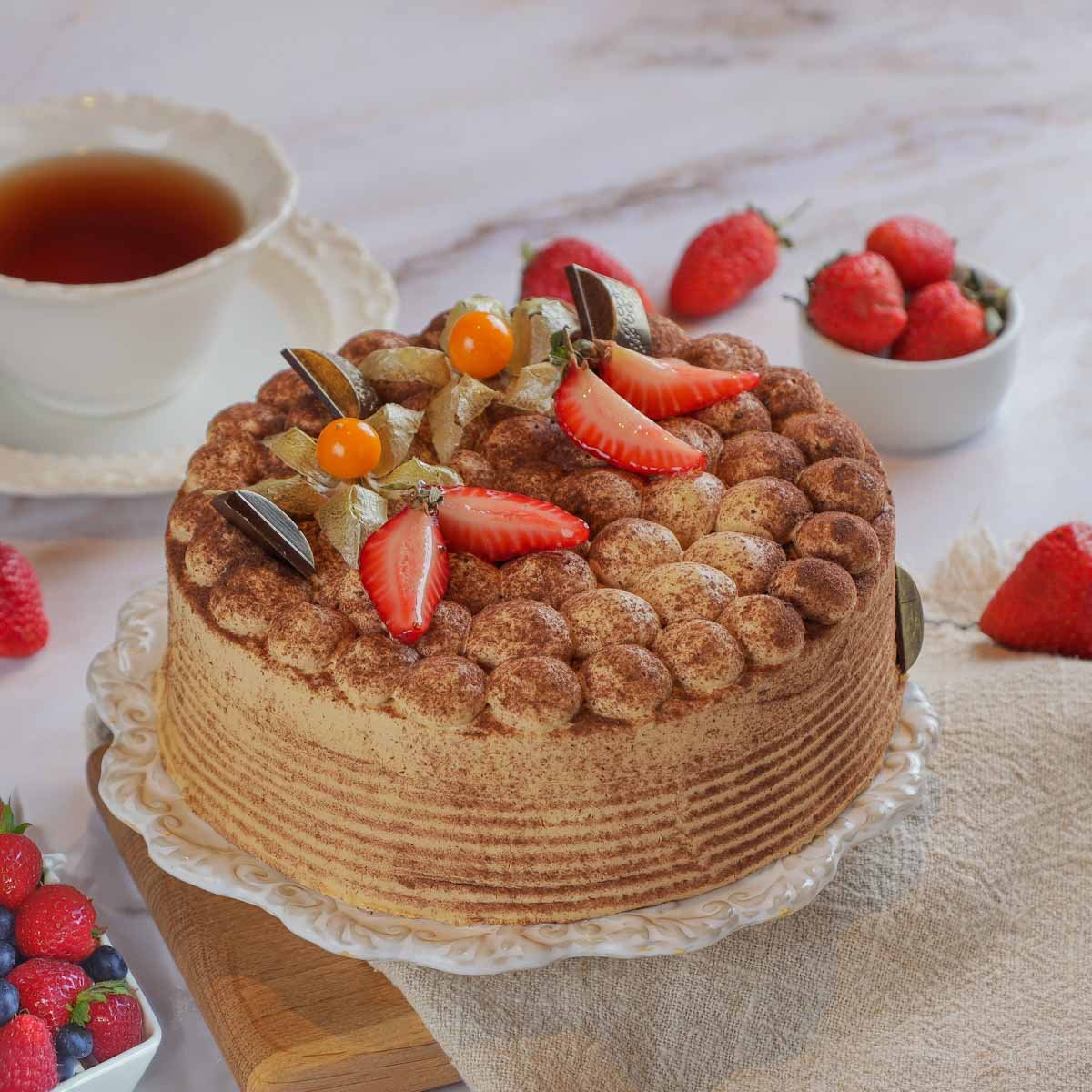 Торт "Песочный Романтика" — это десерт, наполненный нежностью и утонченностью. В его основе — песочные коржи, пропитанные сливочным маслом, в сочетании с кремом на основе молока сгущённого варёного и сметаны. Клубника, шоколадная глазурь и какао-порошок дарят этому торту восхитительный вкус, который хочется чувствовать снова и снова. Всплеск вкуса завершают физалис и коньяк, придающие этому угощению необыкновенную глубину. Наслаждайтесь этим шедевром с доставкой прямо домой.