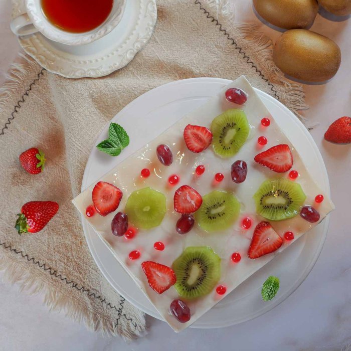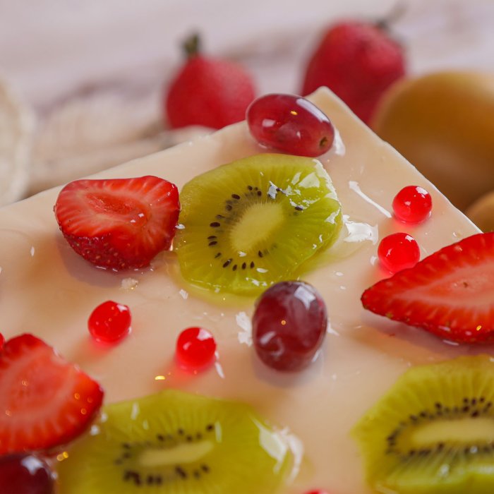 Торт «Радужный» — это настоящее наслаждение не только для вкусовых рецепторов, но и для глаз. Яркие бисквитные коржи из яиц, муки и сахара пропитаны сиропом с тонкими нотками рома и коньяка, создавая сочную основу. Начинка из свежих фруктов и ягод — клубники, киви, винограда, черники, вишни и смородины — делает каждый кусочек насыщенным и освежающим. Ананасы и персики добавляют экзотические нотки, а гель кондитерский и желатин придают нежную текстуру. Благодаря доставке торт прибудет к вам свежим и готовым подарить радость и праздник.