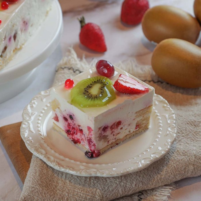 Возможно наличие косточек вишни. Сметана, сахар, бисквит (яйцо куриное, мука пшеничная в/с, сахар), сироп (сахар, коньяк, ароматизатор Ром), клубника, виноград, гель кондитерский, киви, желатин, ананас консервированный, персик консервированный, вишня, смородина, черника, брусника, крахмал, ванилин.