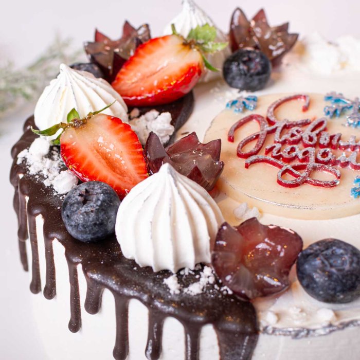 Яйцо куриное, сахар, масло сливочное, молоко, шоколадная глазурь, мука пшеничная в/с, клубника, желатин, ежевика, посыпка, красная смородина, голубика, коньяк, ванилин, ароматизатор Ром.
