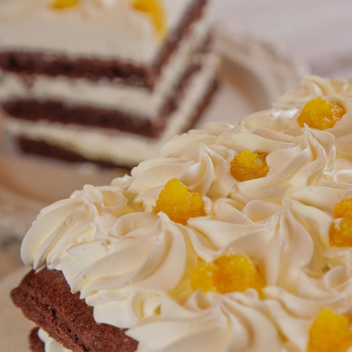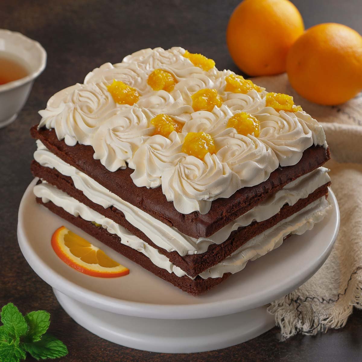 Яйцо куриное, сахар-песок, масло подсолнечное, смесь кондитерская, мука пшеничная в/с, заварной крем, молоко, сливки растительные, апельсины свежие, сахар-песок, загуститель.
