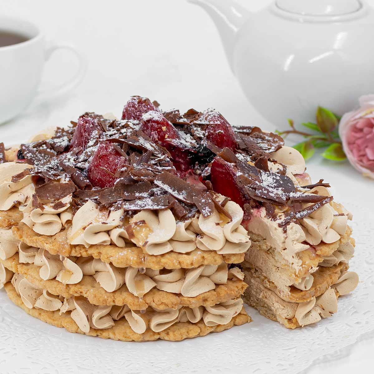 Мука пшеничная в/с, сливки растительные, молоко сгущенное вареное, черника, клубника, масло сливочное, сметана, сахар, яйцо куриное, шоколадная глазурь, гель кондитерский, сода, крахмал, сахарная пудра.