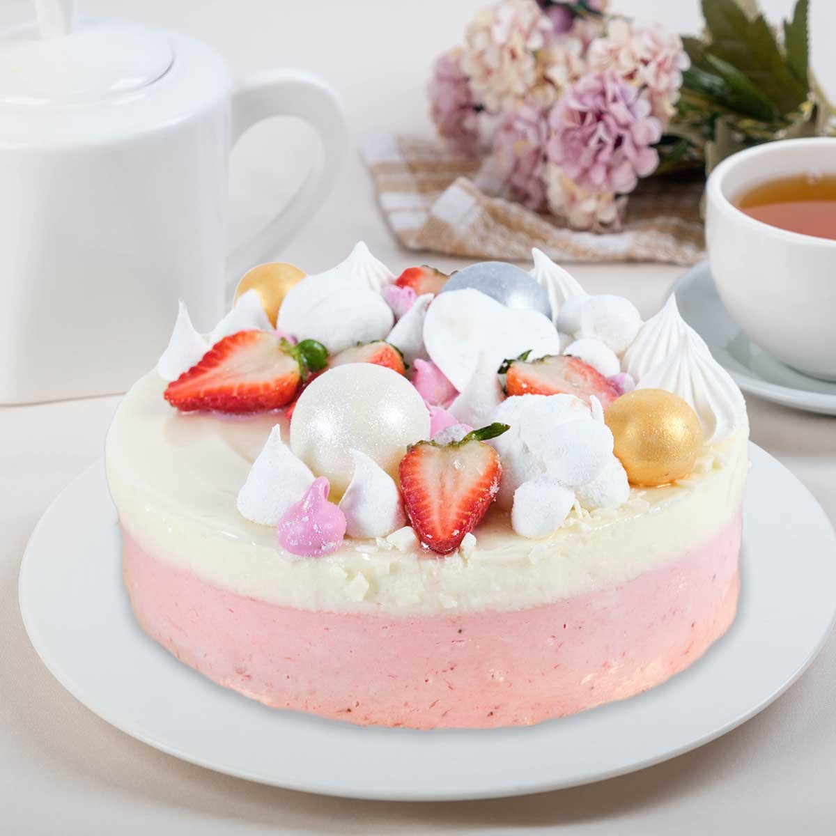 Бисквитные коржи, протипанные сахарным сиропом, прослоенные нежным клубничным кремом и молочным шоколадом. Сверху украшен мастикой. *Оформление торта может отличаться от картинки.
