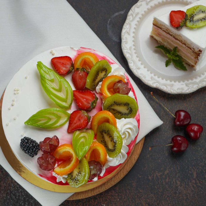 Заказной торт с фруктами – это изысканное сочетание легкости и свежести. Воздушный бисквит, приготовленный из муки, яиц и сахара, пропитан нежным сметанным кремом с добавлением сгущенного молока и ванилина. Для истинных гурманов мы предлагаем два слоя крема – сливочный и сметанный, которые делают текстуру ещё более утончённой. Яркие фрукты – яблоки, апельсины, киви, клубника, красная смородина, ежевика, а также изысканные начинки манго и клубники – создают настоящий фейерверк вкусов. Нотки коньячного сиропа придают пикантности, а доставка позволяет насладиться этим фруктовым шедевром без хлопот.