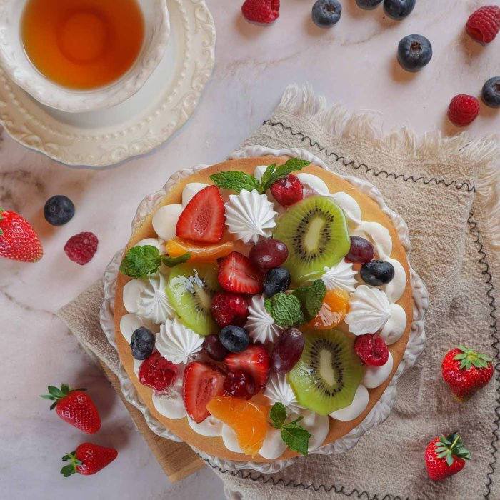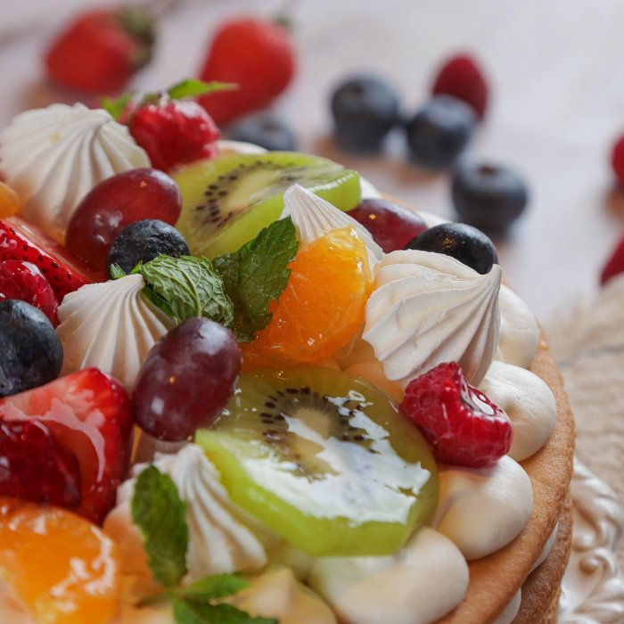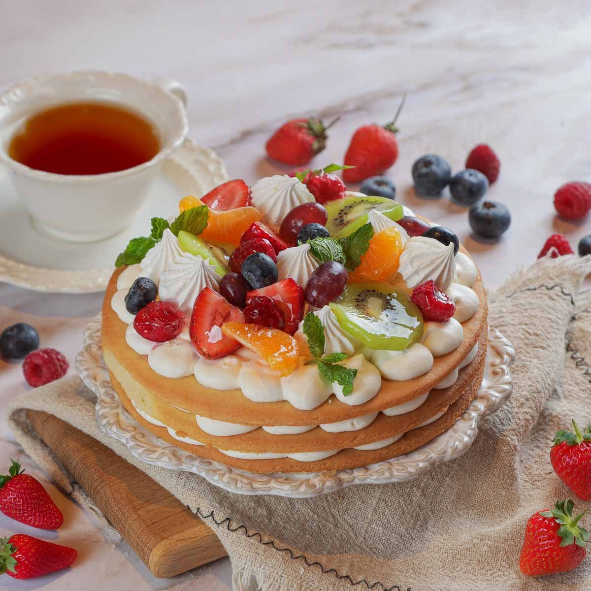 Сметана, сахар, мука пшеничная в/с, масло сливочное, клубника, виноград, киви, яйцо куриное, апельсин, гель кондитерский, голубика, малина, сода, ванилин