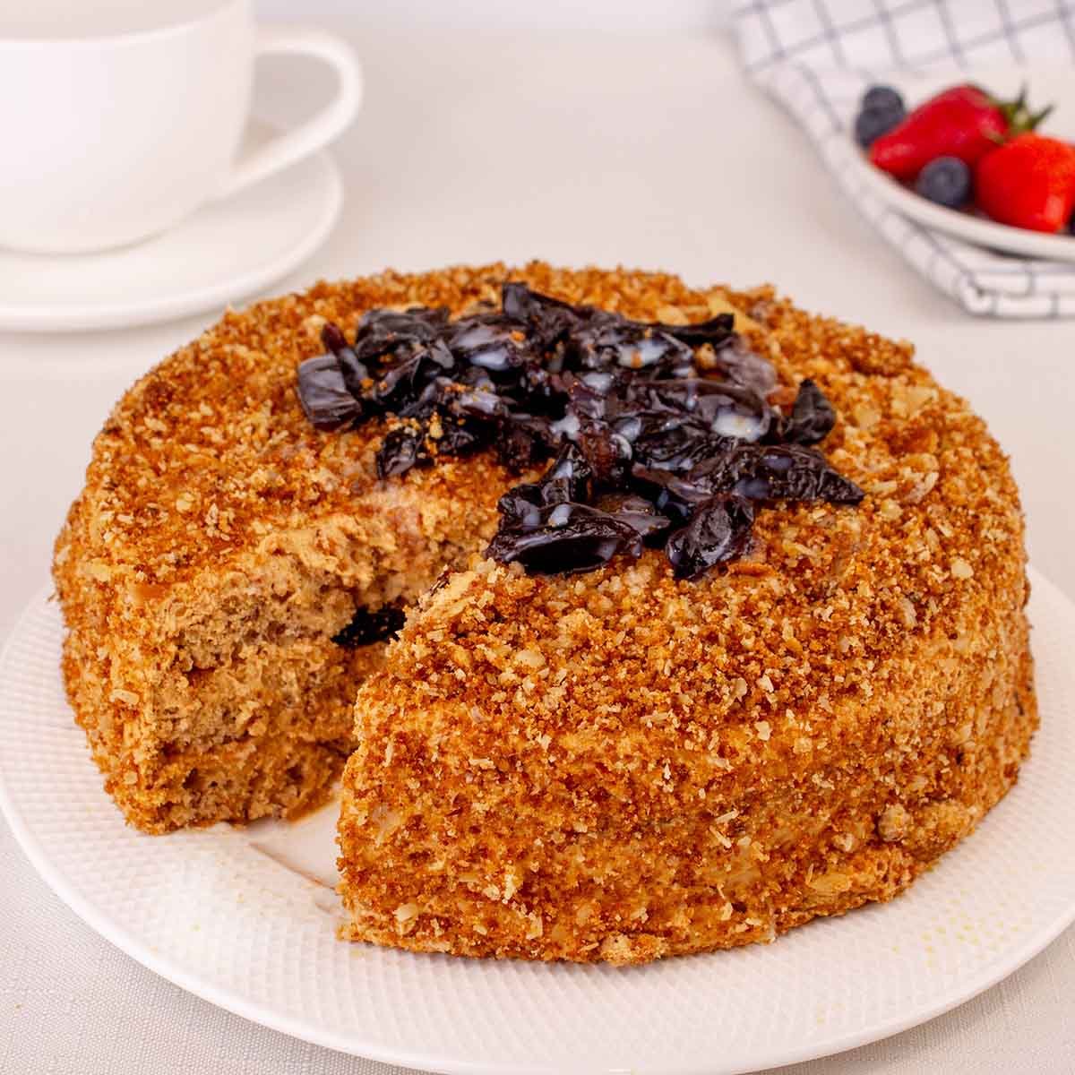 Торт "Живоглот" впечатляет своей многослойной текстурой и насыщенным вкусом. Лёгкие коржи из меда и муки пропитаны кремом на основе сметаны и варёного сгущённого молока. Чернослив и грецкие орехи добавляют изысканный акцент, а аромат "Рома" и нотки коньяка подчёркивают изысканность. Быстрая доставка сохранит свежесть и вкус десерта.