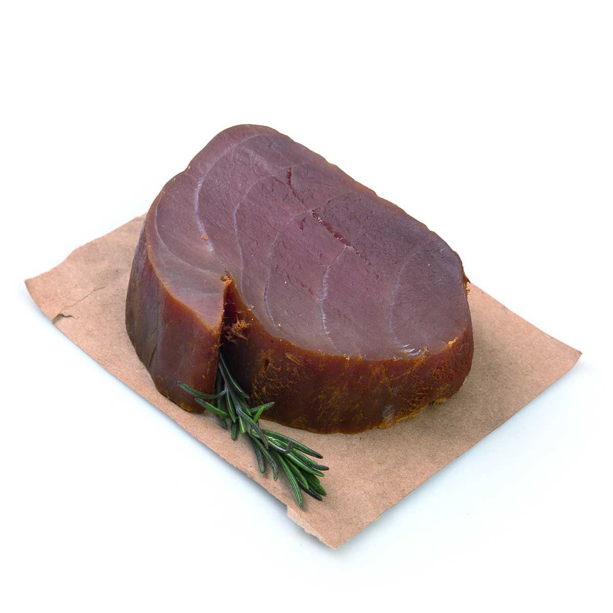 «Морская телятина» – именно так прозвали этот рыбный деликатес за его особый солоноватый вкус и выраженную текстуру. Тунец коптится по специальной технологии, которая лишь тонко подчеркивает природную насыщенность рыбы, но сохраняет нежность продукта. Отличная альтернатива мясным деликатесам — попробуйте с каперсами и оливками.