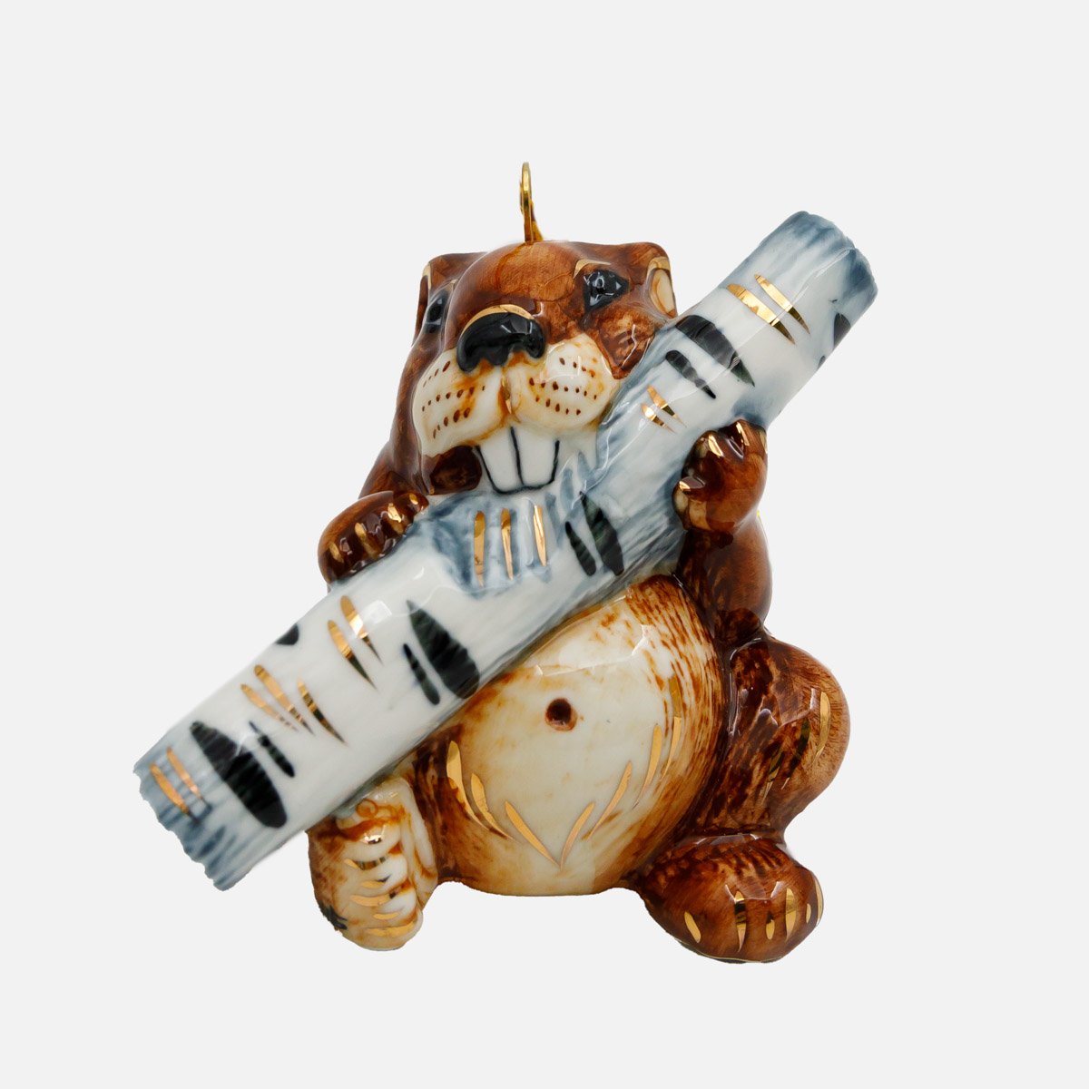 Украшение елочн Лефортовский фарфор Бобер с бревном рыжий фарфор8х7х6,5
