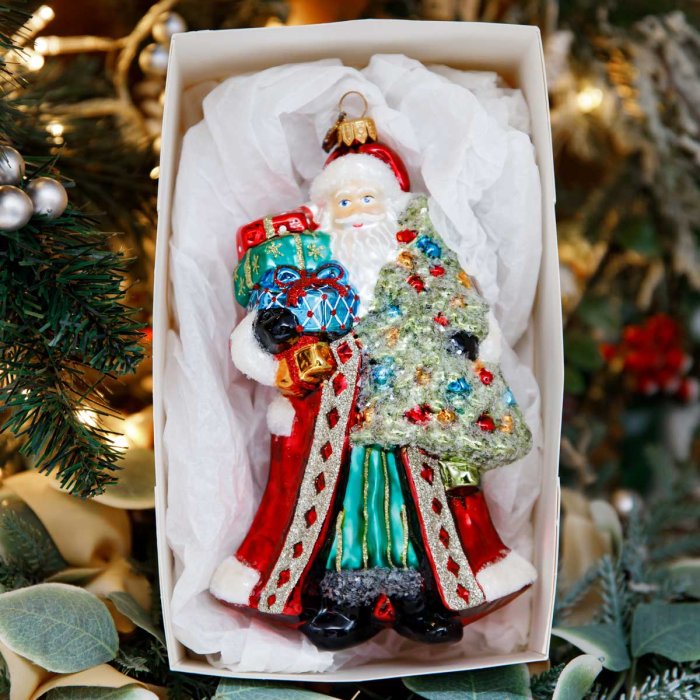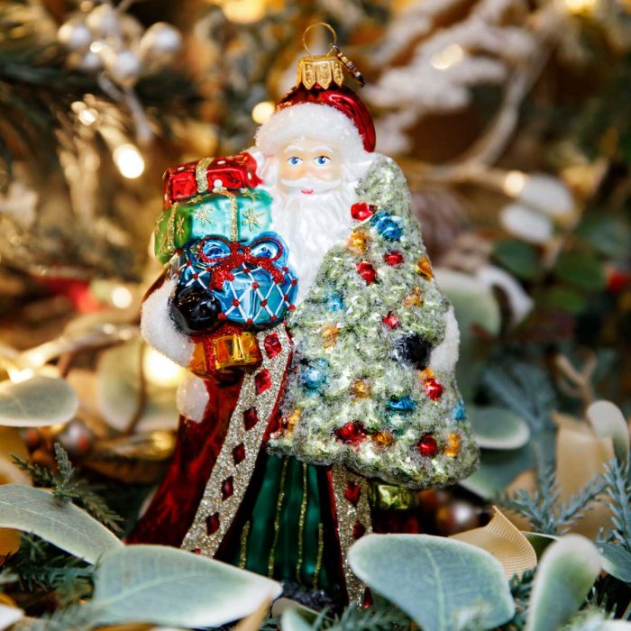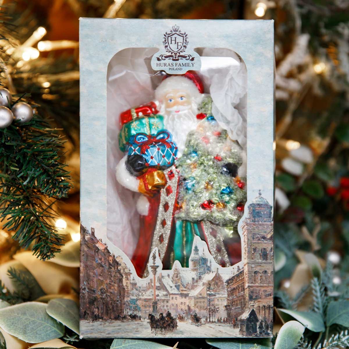 Украшение елочное Дед Мороз с елкой стекло 18х11см S819