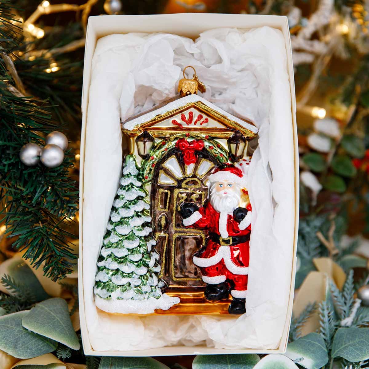 Украшение елочное Дед Мороз у двери стекло 16х12см S334