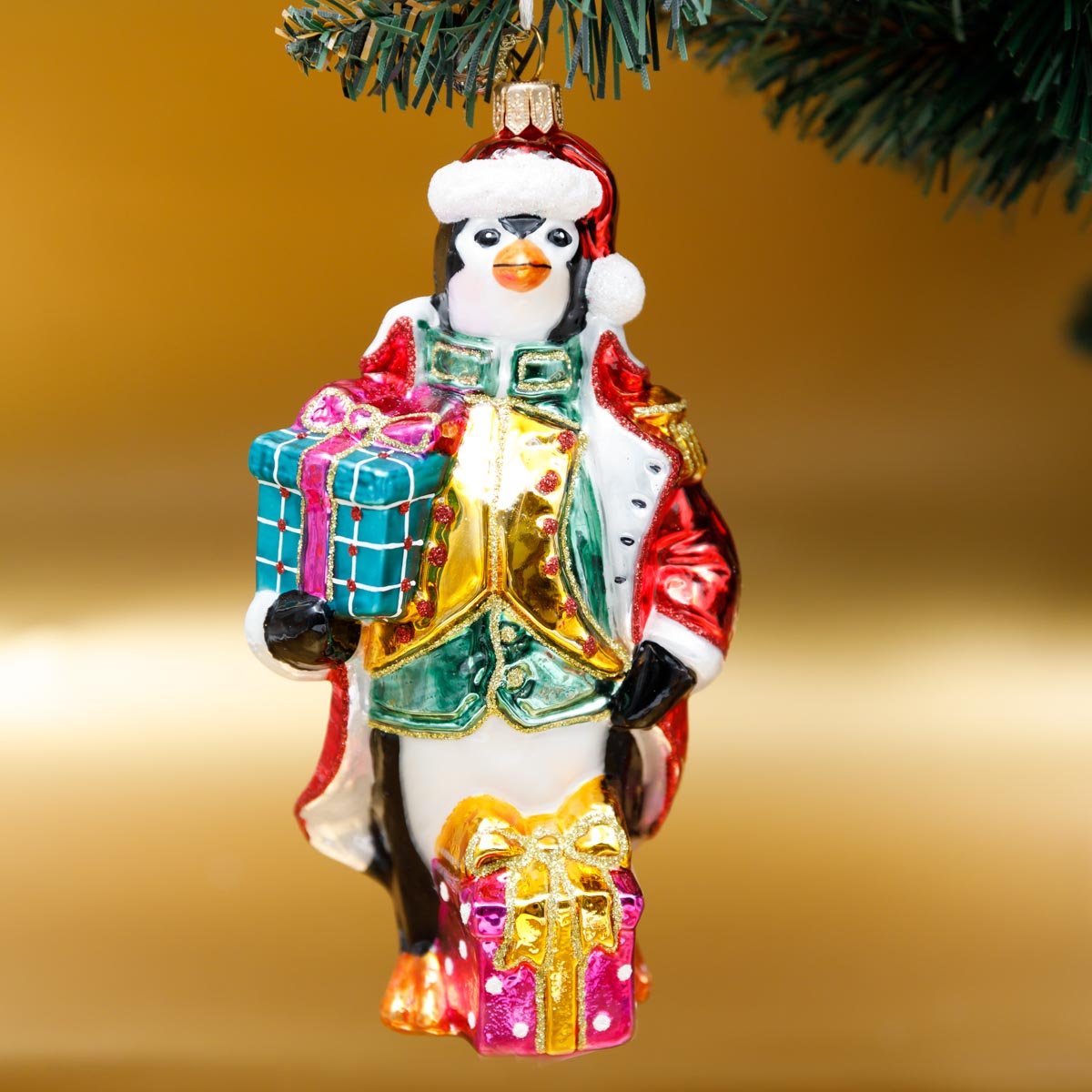 Украшение елочное Пингвин с подарками стекло 16х8см S775