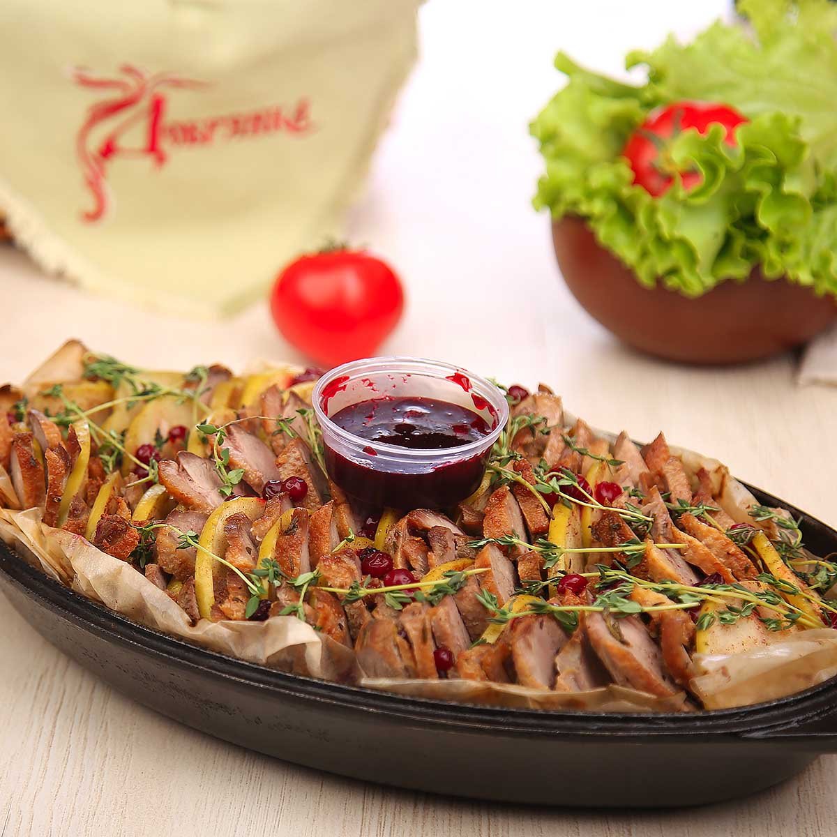 Кусочки утиной грудки, томленые с яблоками и брусникой в пряном соусе из тимьяна, лимона и корицы. Это стоит попробовать!