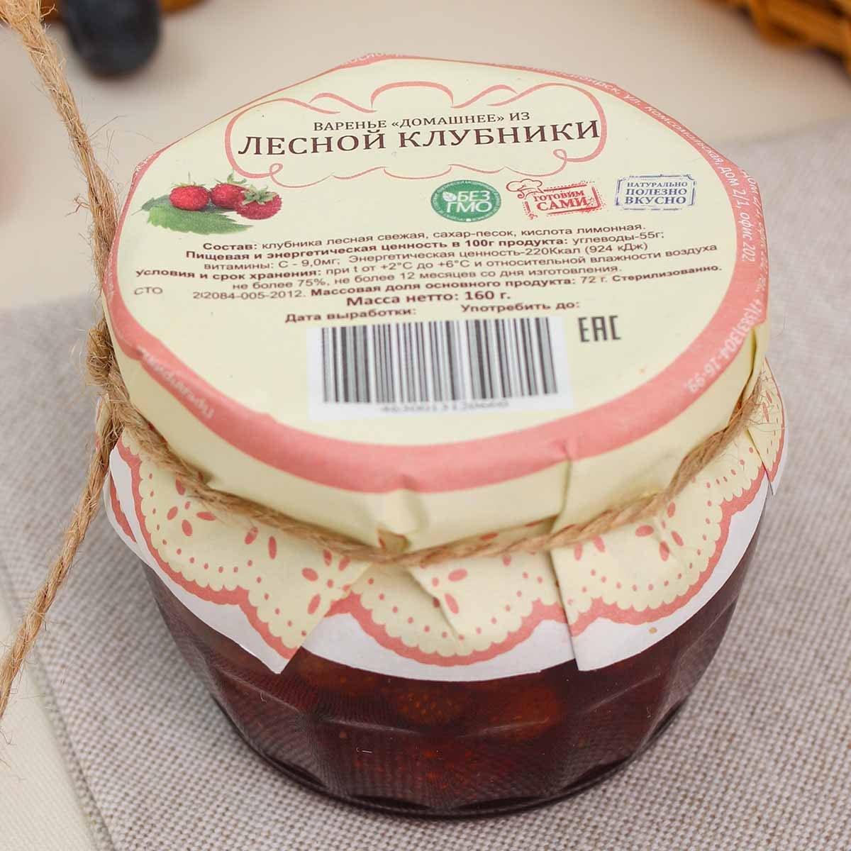 Клубника лесная свежая, сахар-песок, кислота лимонная. Витамины: С - 9мг.
