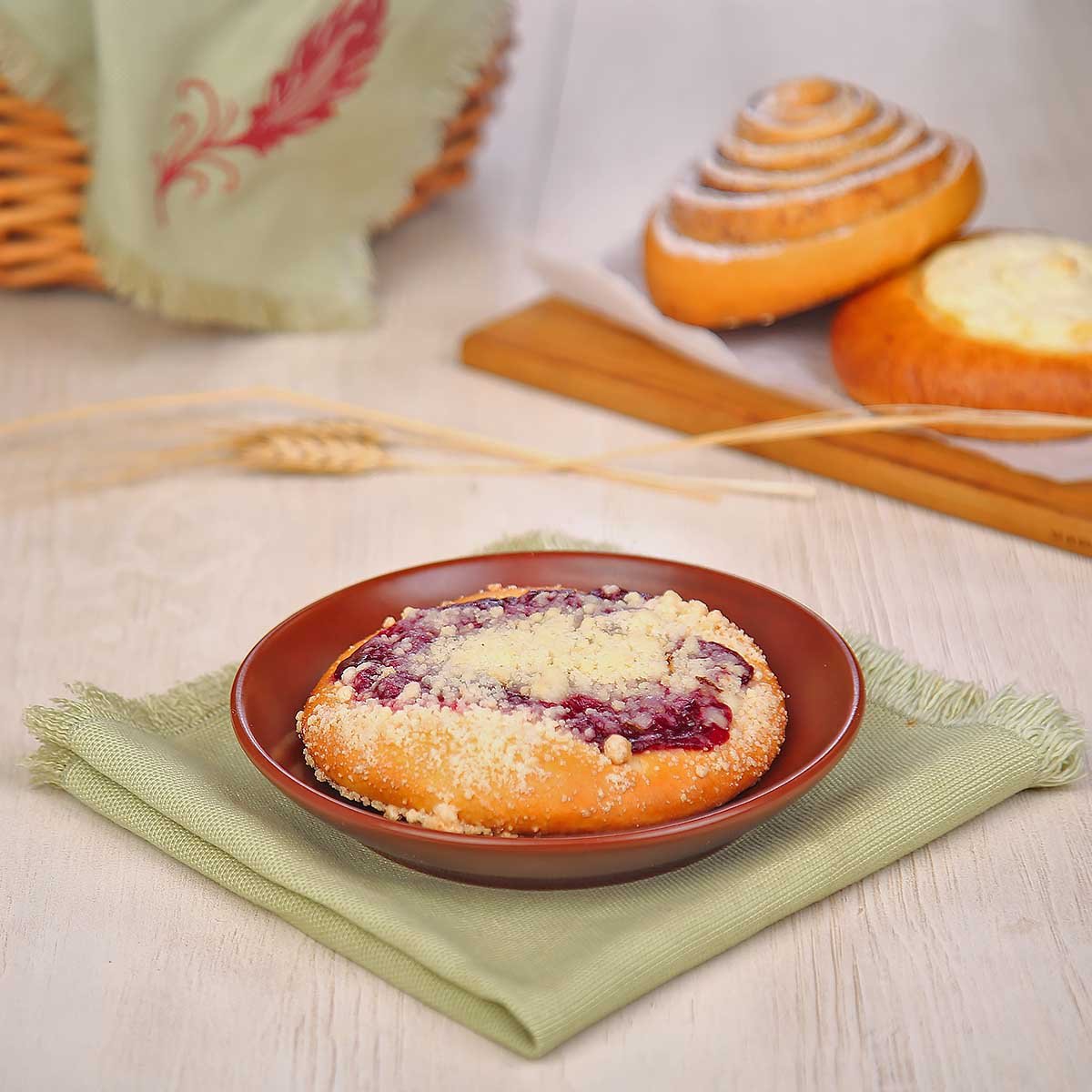Мука пшеничная в/с, вишня, сахар-песок, молоко цельное, масло сливочное, яйцо куриное, сахарная пудра, масло подсолнечное, крахмал, дрожжи прессованные, соль, ванилин.