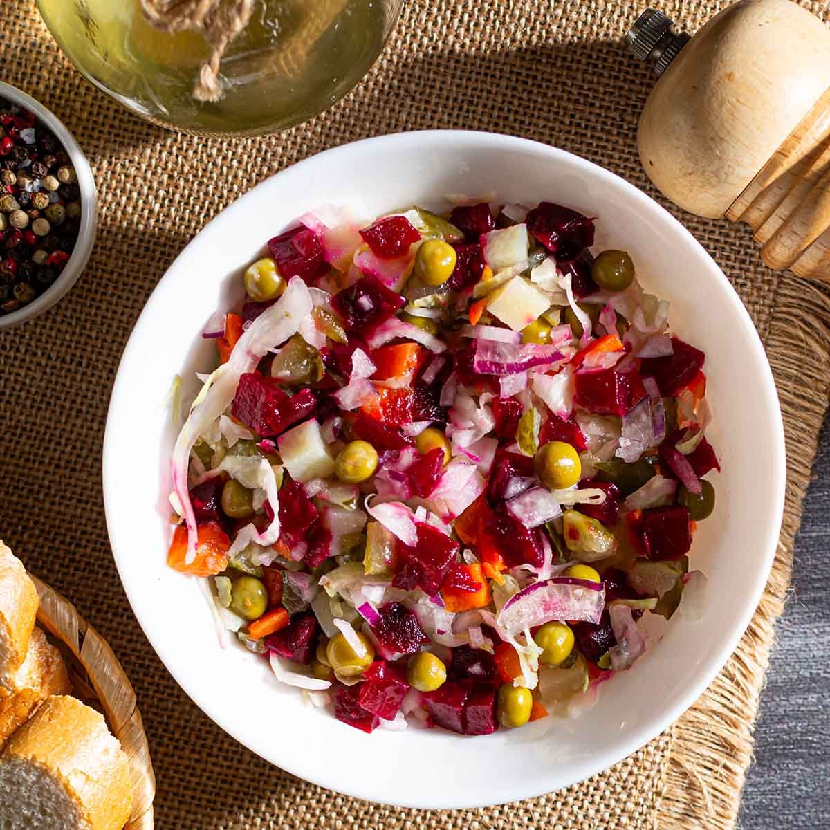 Этот салат ценят в любое время года. Калейдоскоп цвета и вкуса. Разноцветные кубики свеклы, моркови, картофеля, бусины горошка с хрустящими огурчиками, ядреной капустой и свежим зеленым луком.
