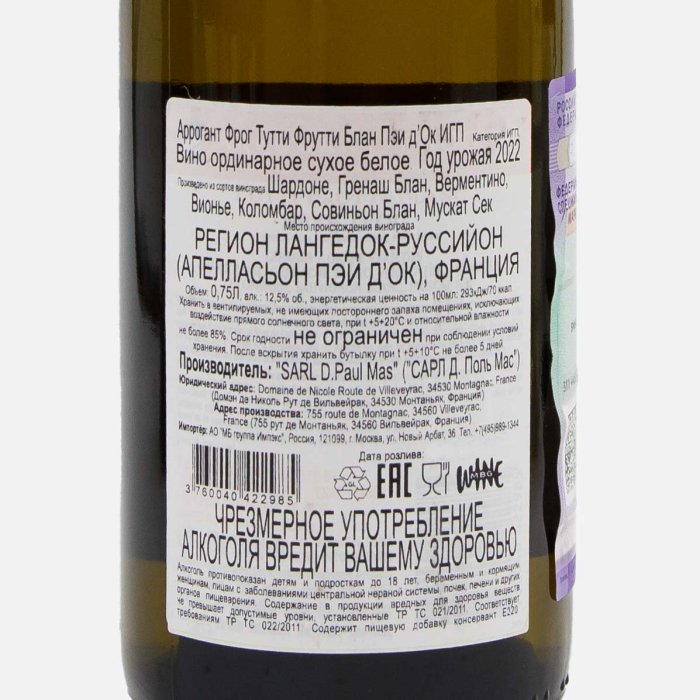Вино Аррогант Фрог Тутти ФруттиБлан Пэи д'ОкИГП бел сух7.5-12.5%0,75