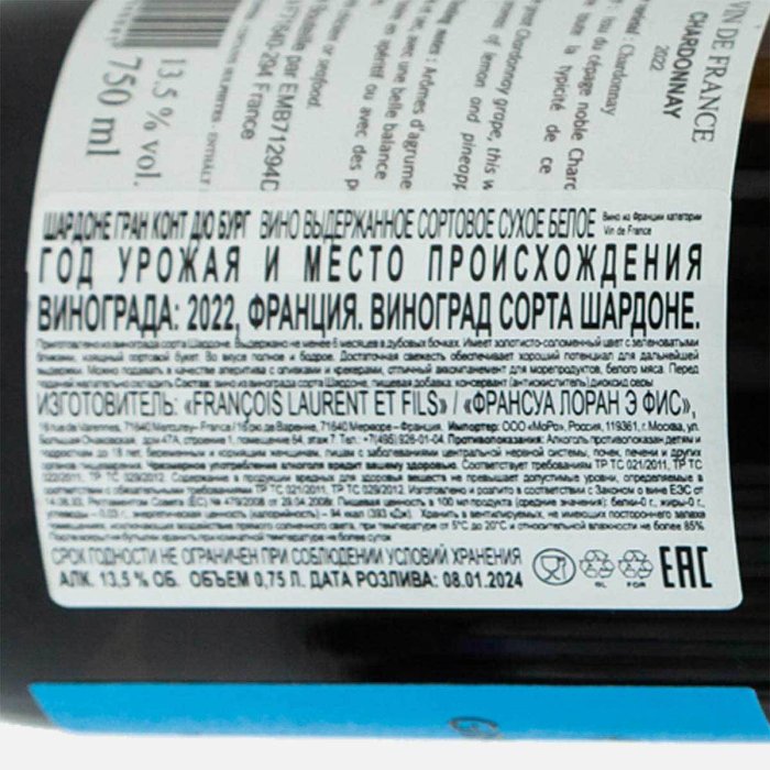 Вино Гран Конт Дю Бург Шардоне сорт выд бел сух 12% ст/б 0,75л