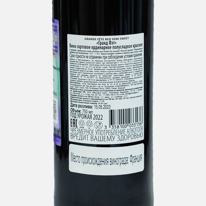 Вино Гранд Фэт сорт орд кр п/сл 11% ст/б 0,75л