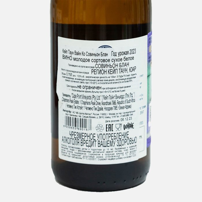 Вино Кейп Таун Вайн Ко СовиньонБлан мол сорт бел сух 7.5-12.5% ст/б0,75