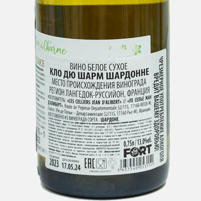 Вино Кло дю Шарм Шардонне бел сух 13% ст/б 0,75л