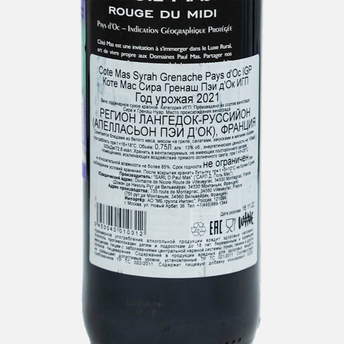 Вино Коте Мас Сира Гренаш Пэи д'Ок ИГП орд кр сух 7.5-13% ст/б 0,75л