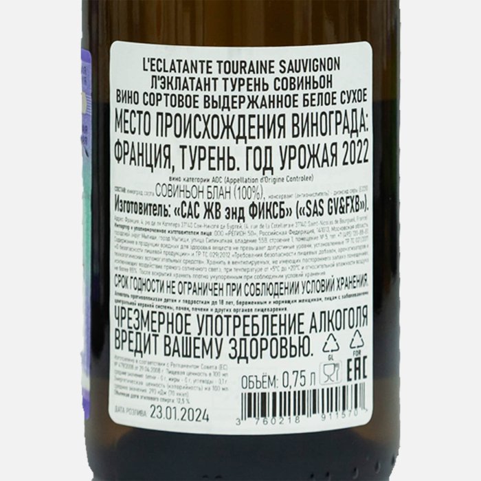 Вино Л'Эклатант Турень Совиньон сорт выд бел сух10-12.5% ст/б 0,75л