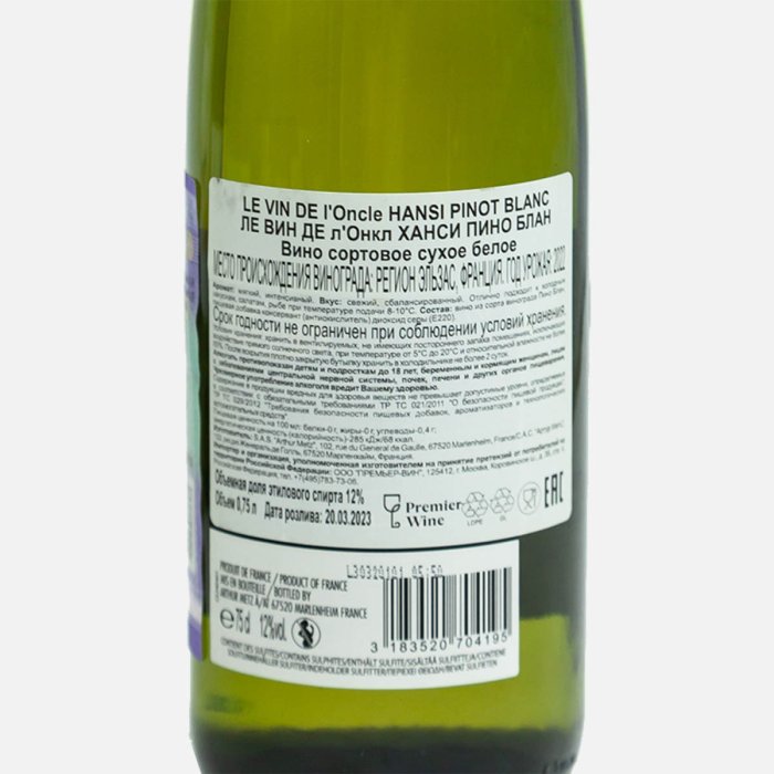 Вино Ле Вин де л'Онкл Ханси Пино Блан сорт бел сух 12% ст/б 0,75л