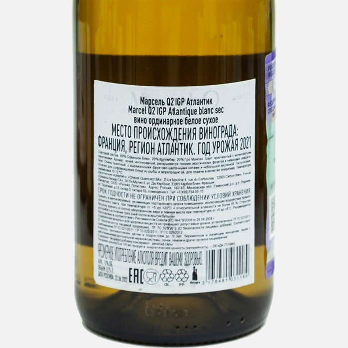 Вино Марсель Q 2 ИГП Атлантик бел сух 8-12% ст/б 0,75л