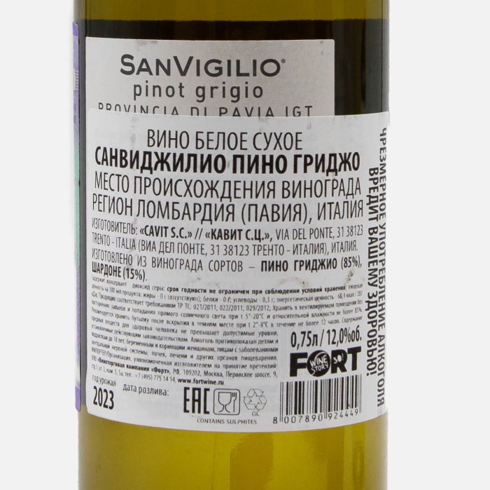 Вино СанВиджилио Пино Гриджо бел сух 12% ст/б 0,75л