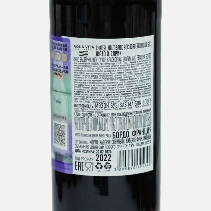 Вино Шато О-Сарик Бордо АОС выдер кр сух 9-14.5% ст/б 0,75л
