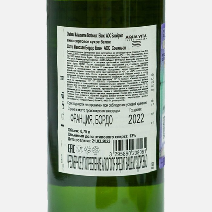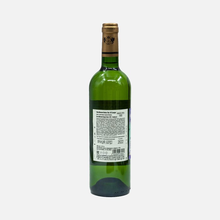 Вино ШатоМалозанБордоБланСовиньон АОС сорт бел сух 10-13% ст/б 0,75л