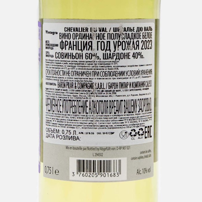 Вино Шевалье Дю Валь бел п/сл 9-12% ст/б 0,75л