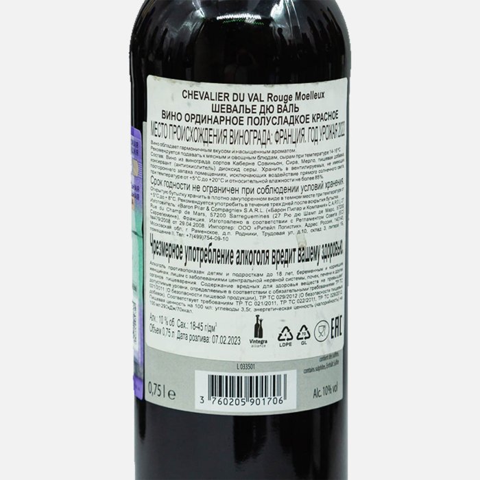 Вино Шевалье Дю Валь орд кр п/сл 9-10% ст/б 0,75л