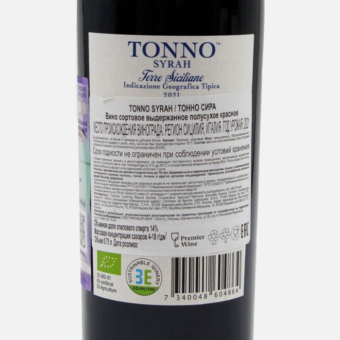 Вино Тонно Сира сорт выд кр п/сух 14% ст/б 0,75л