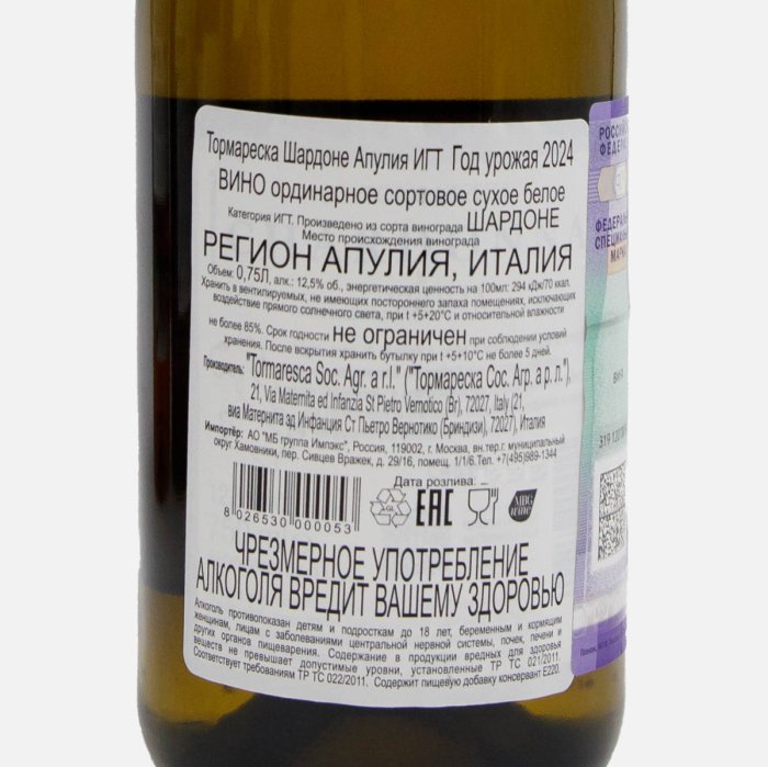 Вино Тормареска Шардоне Апулия орд сорт бел сух 11-12.5% ст/б 0,75л