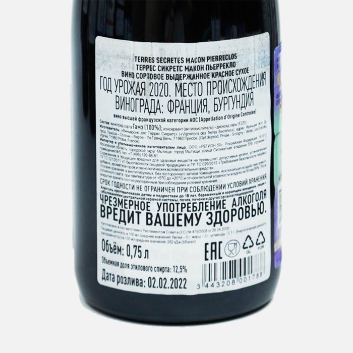 ВиноТерресСикретсМаконПьеррекло сорт выд кр сух 8.5-12.5% ст/б 0,75