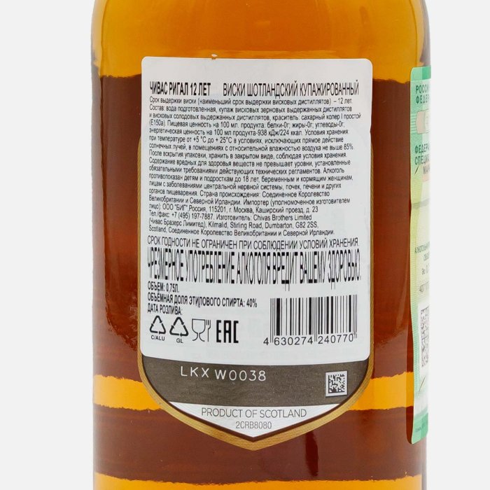Виски Чивас Ригал 12лет шотланд купажированный 40% ст/б 0,75л