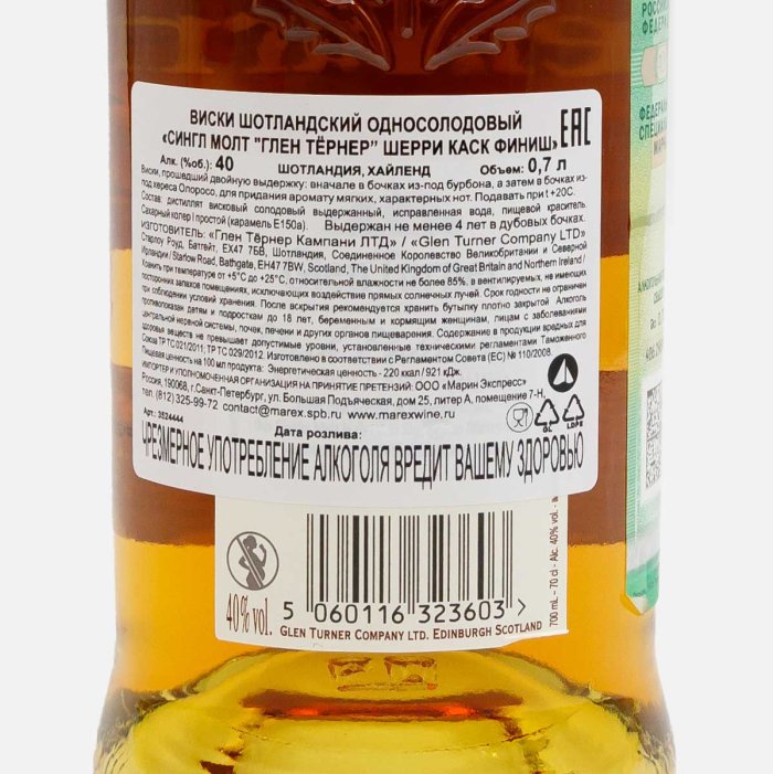 ВискиГленТернерСинглМолтШерри Каск Финиш шотланд односол 40% п/у 0,7л