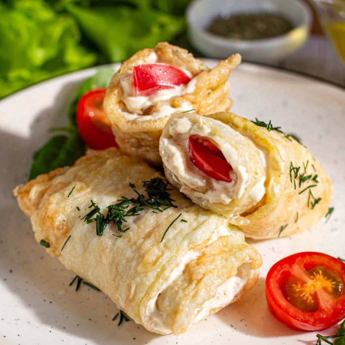 Аппетитные рулетики из обжаренных кабачков с начинкой из спелых помидоров с чесноком и майонезом